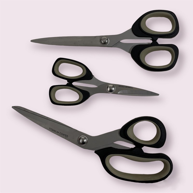 Forbici con lama in acciaio inox rivestito in titanio, manici ergonomici con interno in gomma, lavabili in lavastoviglie.